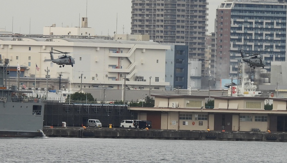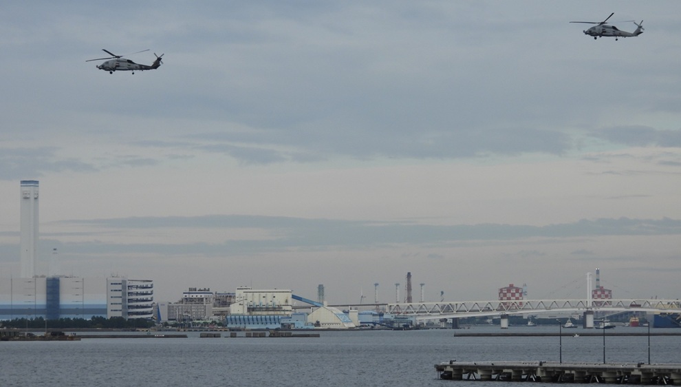 横浜港内での周回飛行訓練とタッチアンドゴー訓練(離着陸訓練)を執拗に繰り返す、2機編隊のHSM-51所属のMH-60Rヘリコプター(25.11.6 星野 撮影)