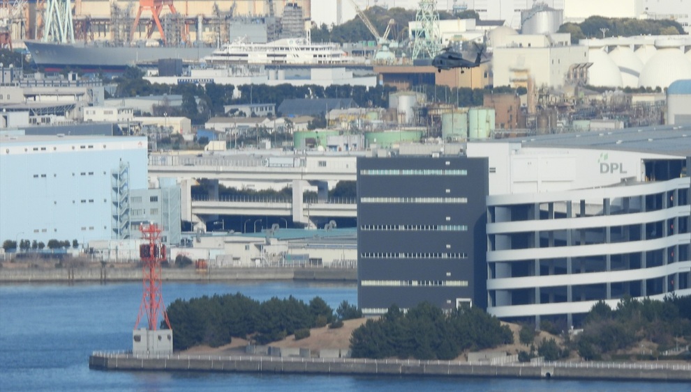 今年1月29日、横浜港内で周回飛行訓練を行うHSM-51所属のヘリ。ジャパンマリンユナイテッド鶴見工場で整備中の海自補給艦「ときわ」も見える(26.1.29 星野 撮影)