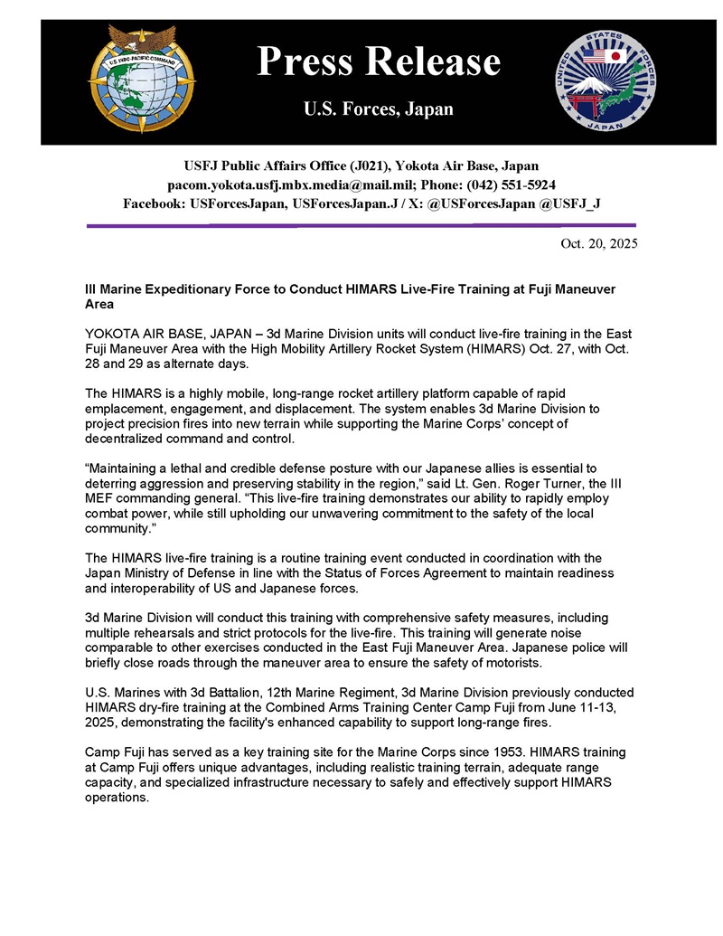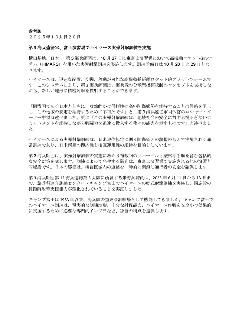 10月27日の東富士演習場でのハイマースの実弾射撃にかんして、在日米軍が発表したプレスリリースとその「参考訳」