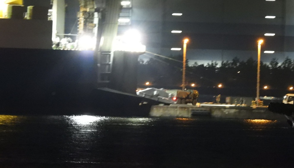 作業は長時間にわたって続けられていたのだが、すっかり暗くなり夜になった18時台になって、ハイマースが現れ、自走で後ろ向きにランプウェイを登って船内に入っていくのが見えた。