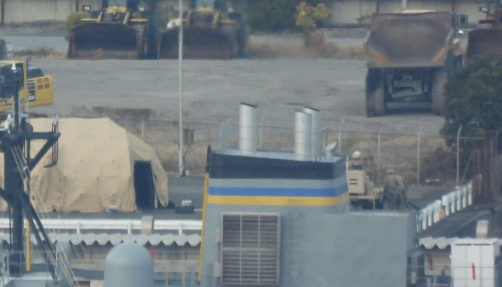 3月9日夕方の横浜ノースドック。ハーバーマスター分遣隊の訓練のための設営作業が進められていた(26.3.9 星野 撮影)