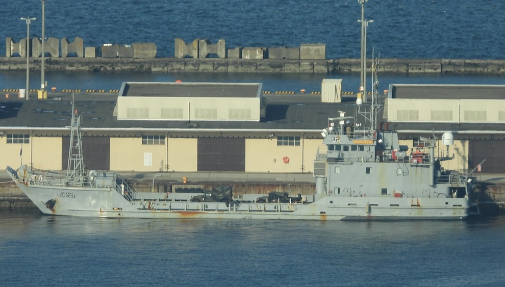 揚陸艇パロ・アルト。3月10日にノースドックの「すべり」に着岸して前部のバウ・ランプから2台の軍用車両を甲板に載せた。