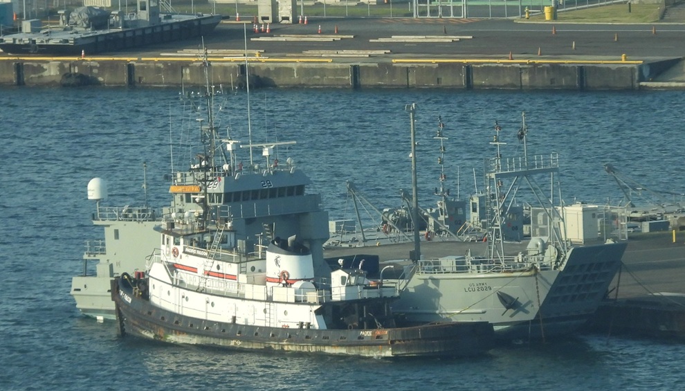 4月3日、横浜ノースドックに搬入された揚陸艇モリノ・デル・レイと、はるばる米国から引っ張ってきたタグボート、パシフィック・ファルコン(26.4.3 星野 撮影)