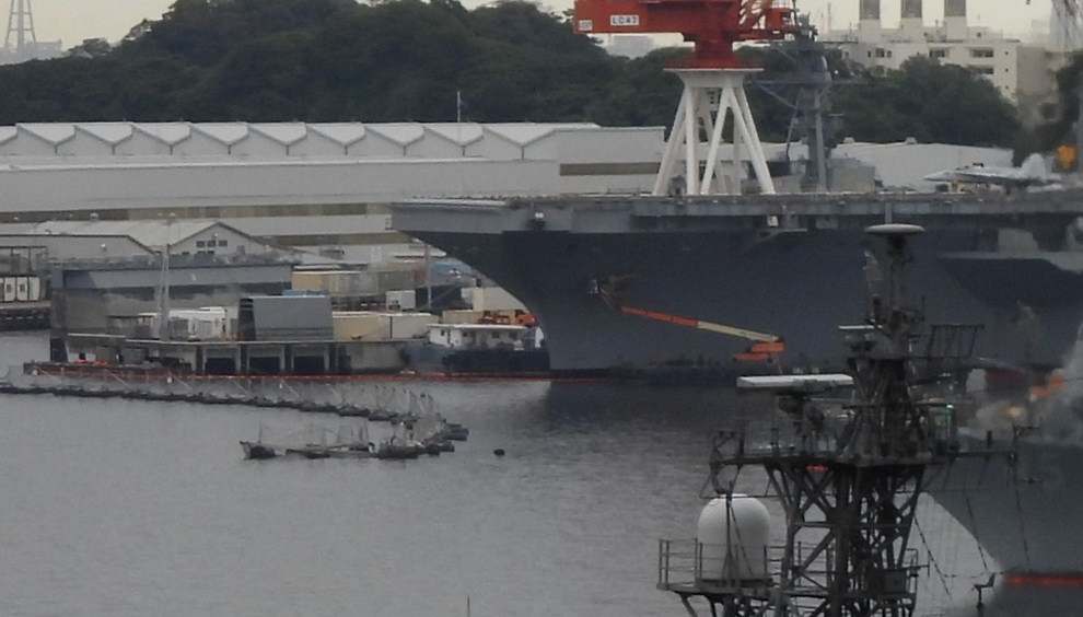 手前の12号バースは原子力空母ジョージ・ワシントン。飛行甲板にはハンドリング訓練用の、FA18戦闘攻撃機のエンジンのない実物大模型が置かれている(25.9.15 星野 撮影)