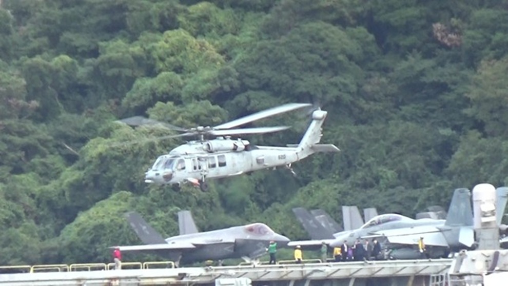 10月28日、MH-60Sヘリは、ボディガードと思しき人々をジョージ・ワシントンに降ろした(25.10.28 木元 撮影)