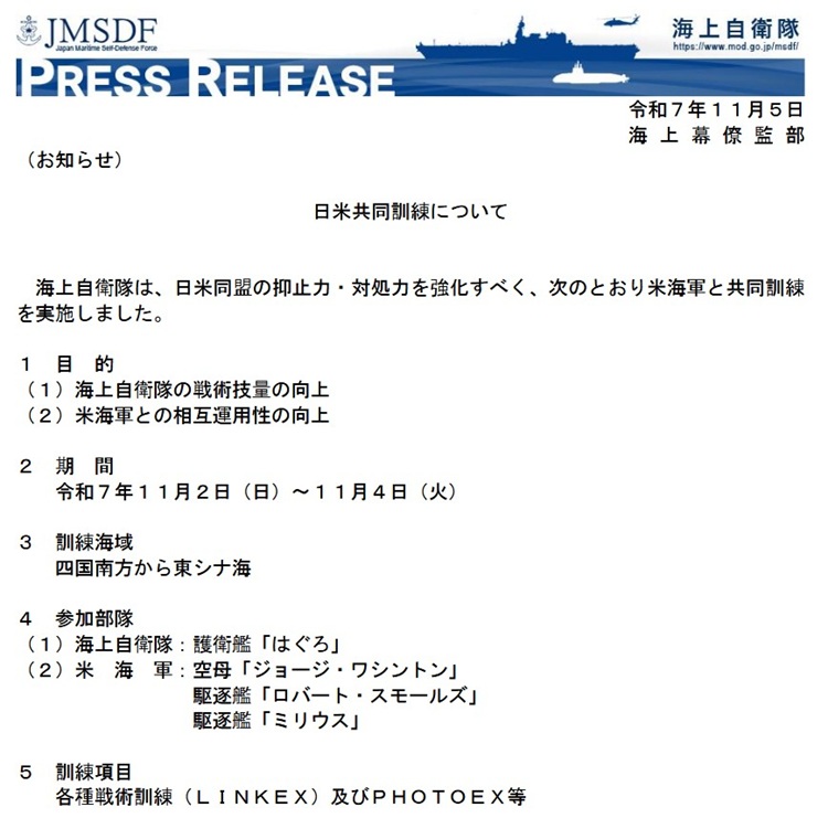 11月2日から4日にかけての日米共同訓練にかんする海上自衛隊のプレスリリース