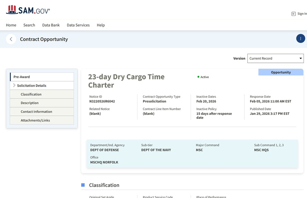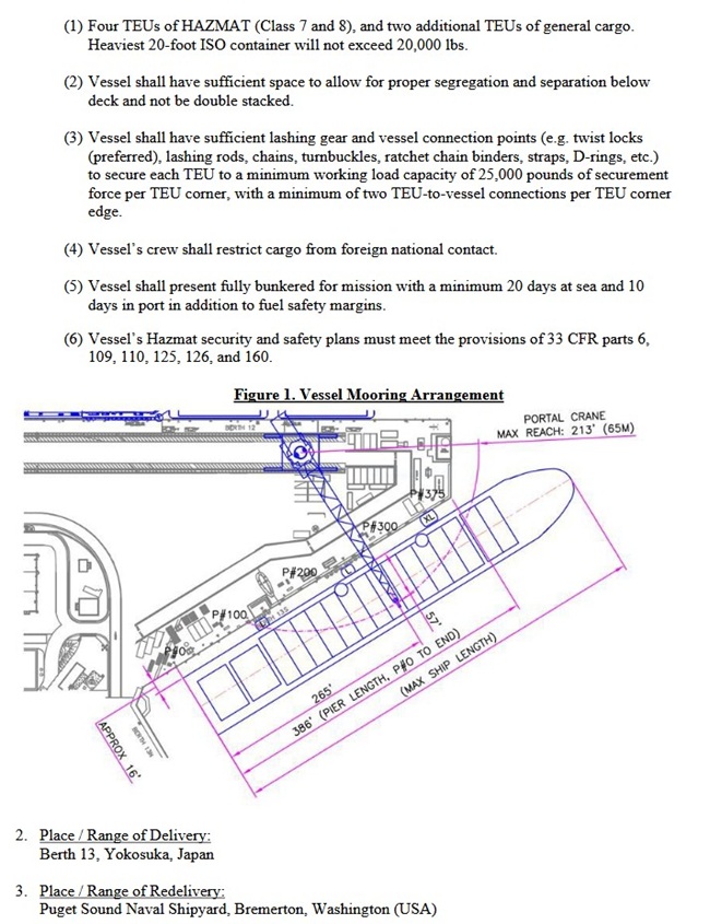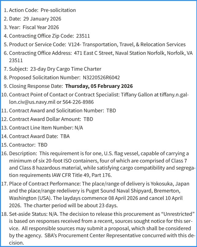 1月29日、米連邦政府の業務公告サイトSAM.GOVに、20フィートISOコンテナ少なくとも6個を、横須賀基地の13号バースから米国ワシントン州ブレマートンのピュージェットサウンド海軍造船所に運ぶ業務に従事する米国船籍の貨物船を公募する入札公告「23-day Dry Cargo Time Charter」(Notice ID:N3220526R6042)が掲示された。