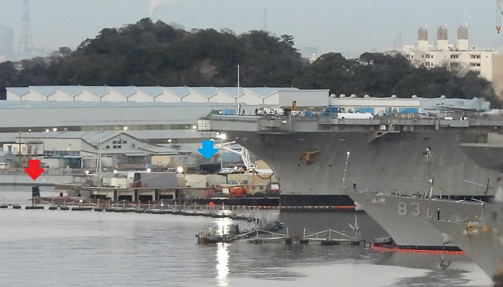 13号バースに停泊する原潜ミシシッピの後舵(赤矢印)とセイル(青矢印)。12号バースには原子力空母ジョージ・ワシントン(26.3.23 星野 撮影)