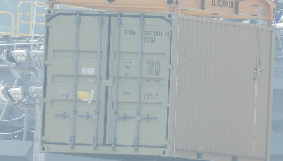 原子力空母から搬出された1個目のコンテナ。放射性物質入りであることを示す表示は見当たらなかった(26.4.15 星野 撮影)