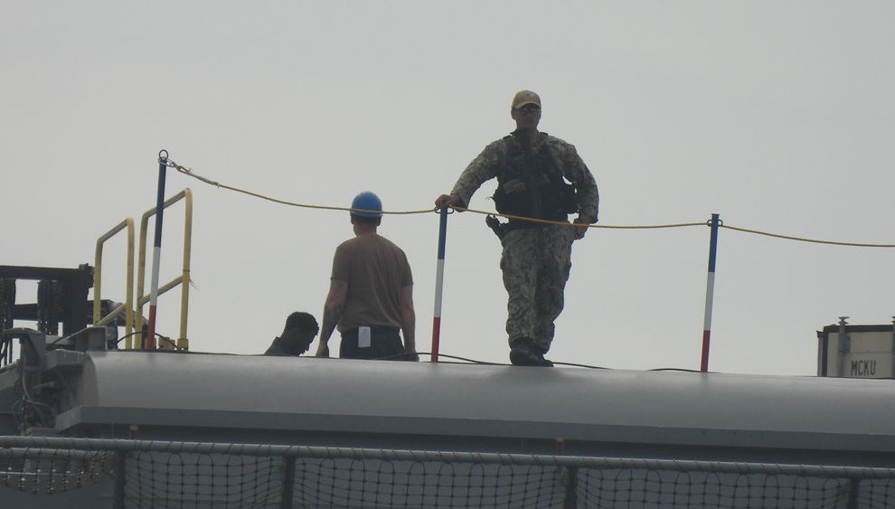 原子力空母の飛行甲板から平和船団を見下ろす武装兵士。小銃を体の前にさげている(26.4.15 星野 撮影)