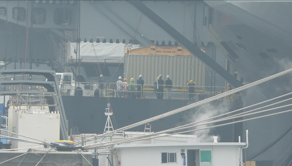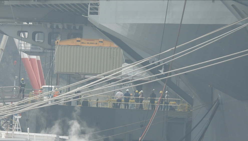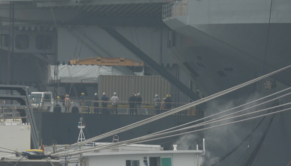 4月15日の午前9時過ぎには空母のエレベーター部分に1つめのコンテナが艦内から引き出されて大型クレーンで吊り上げる作業が開始された。
